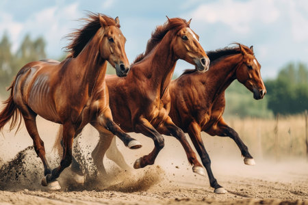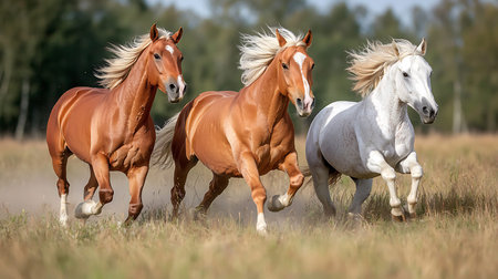 A head of stallion horses, at a sunny day. Galloping dressage horse stallions in a meadow. Breeding horses