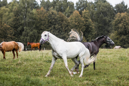 Herd of horses in field. Arabian mares and foals walking outdoor in autumn.