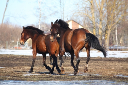 White spotted horse and brown horse portrait, walk on the paddock in winter