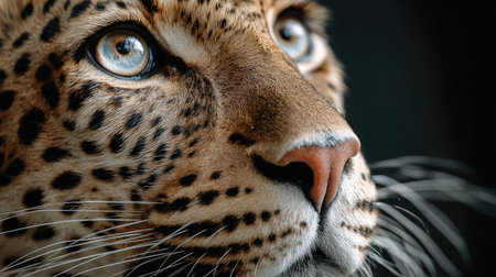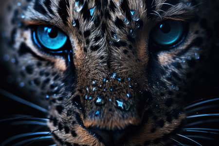 This close-up portrait captures the mesmerizing features of a wild leopard, highlighting its striking blue eyes and unique spotted fur. A stunning showcase of wildlife.