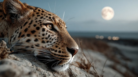 A stunning close-up of a leopard gaze under the illuminated full moon, showcasing its unique fur patterns and serene demeanor in a natural landscape.