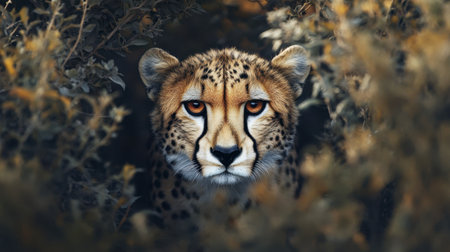 A cheetah emerging from the shadows of a bush, ready to hunt, showcasing its stealth and agility in the wild.