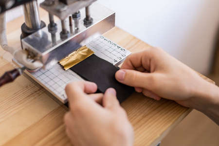 Male tanner stamping stuff use awl and machine device working at leather workshop. Handmade work