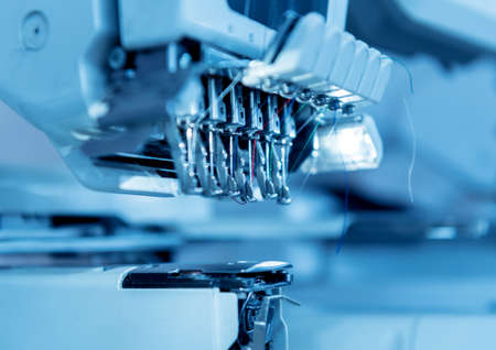 Production line of the sewing machine. Textile industry. Industrial background