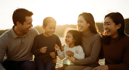A joyful family of five, including parents and three children, smiling and laughing during a warm sunset.