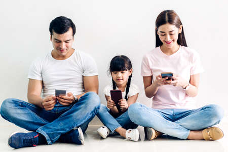 Happy family father and mother with daughter sitting and use technology together of smartphone on wall background