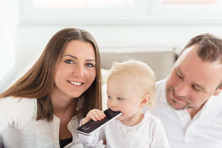 Happy family of three is enjoying at home. Parents sitting on the sofa. Their beautiful baby girl playing with cell phone. Family values. Leisure together.