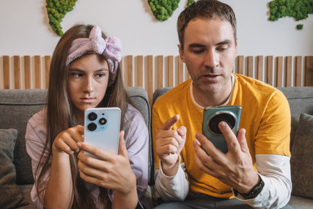 dad peeking at his son phone while boy being glued to his phone