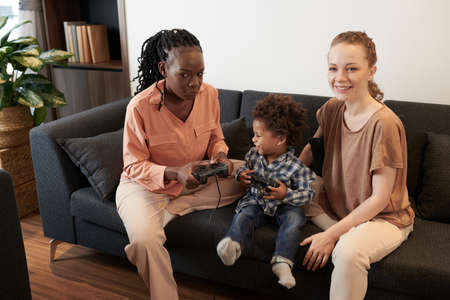 Enthusiastic father playing online video games with his baby boy using controller, both parents enjoying leisure time with their small kid. African american happy family play with a joystick.