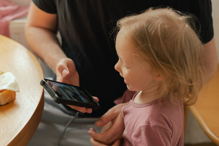Close up baby girl looks at the screen of the phone given by her father. Harmful upbringing of a child with gadgets. Children and technology concept. Part of a series.