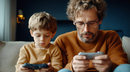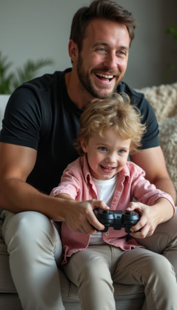 A cheerful father and his young son share a delightful moment while playing video games on a cozy couch. Their laughter and excitement create a warm atmosphere, highlighting the bond of love and joy in their playful interaction.