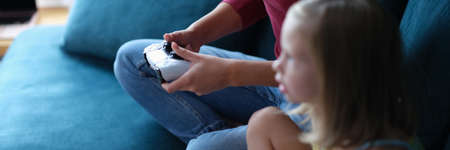 Mother and daughter sitting on couch and playing computer game with joystick closeup