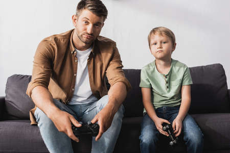 KYIV, UKRAINE - JUNE 9, 2020: displeased father and son holding joysticks and looking at camera