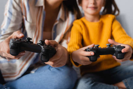 KYIV, UKRAINE - SEPTEMBER 15, 2020: cropped view of mother and daughter gaming with joysticks on blurred background, banner