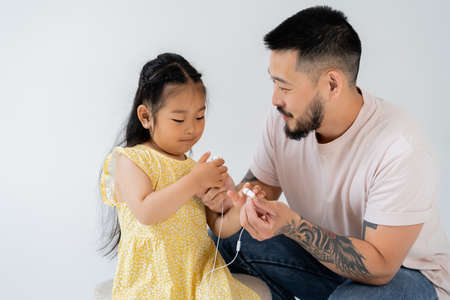 tattooed asian man holding wired earphones near preschooler daughter isolated on grey
