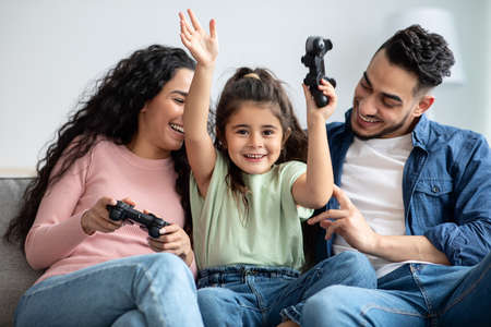 Happy middle eastern family of three playing video games together at home