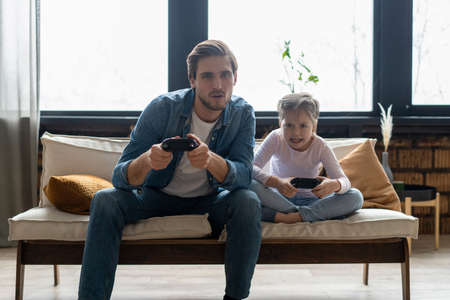 Cheerful joyful excited stylish trendy father and daughter holding joy-sticks in hands playing video game sitting on couch indoor in living room enjoying free time wearing casual outfit front view