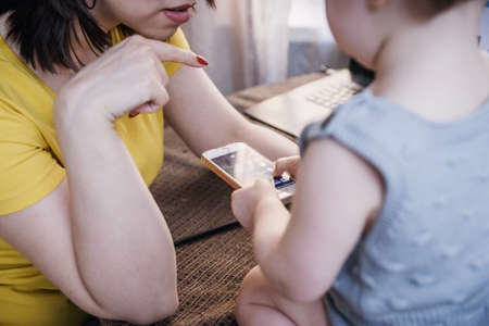 Daytime with family at home. baby cute boy playing games on a tablet or smartphone and watching cartoons. Mother working from home, using smartphone.