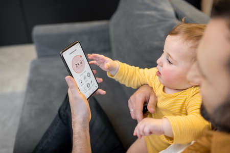 Father with a baby controlling home devices by smartphone with running smart home application at home. Concept of simple and easy management of a smart home