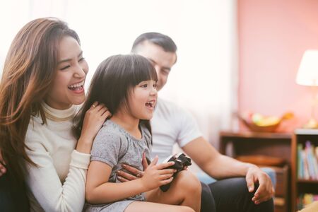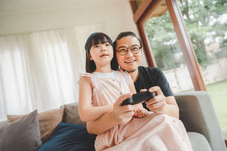 Happy Asian family father and daughter playing video game in living room at home