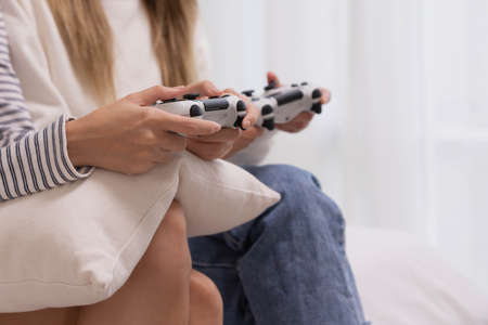 Entertainment, home electronics, gaming concept: a teenager hands holding wireless controller gamepad playing console video game