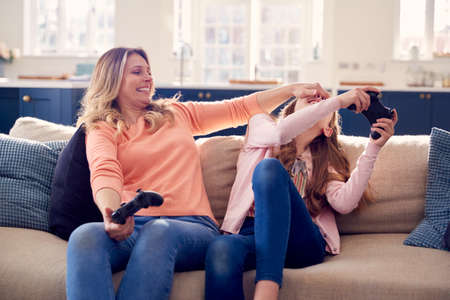 Mother Cheating As She And Daughter Have Fun Sitting On Sofa At Home Playing On Games Console