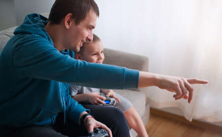 Happy father and son sit in the living room on the sofa and play or watch TV
