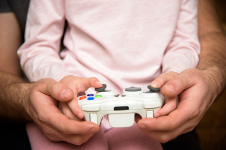 Father and child hands with gamepad close up. Father plays computer games with a child. Child holds gamepad close up.