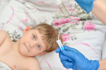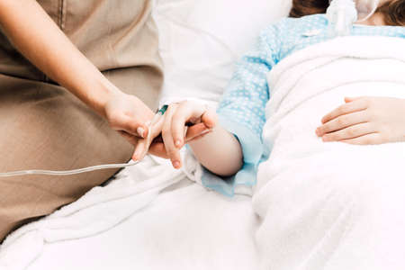 close-up, a catheter for a dropper in a child in a vein. A small patient lies on an operating table, sedation and anesthesia. Diseases that threaten the life of a child. Resuscitation of children. Recovery of vital body functions. Intravenous drip solution
