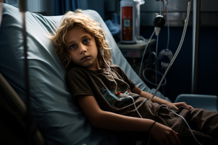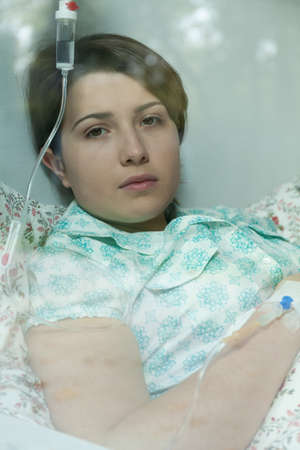 Photo of sad cancer girl lying in bed with her chemotherapy