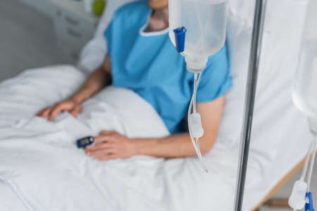 drop counter with intravenous therapy bottle near blurred patient in hospital bed