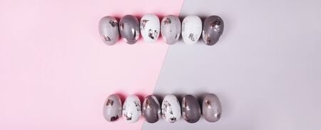Easter eggs in two rows on grey and pink background. copy space.