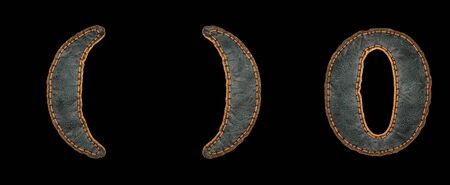 Set of symbols left and right parentheses, number 0 made of leather. 3D render font with skin texture isolated on black background. 3d rendering