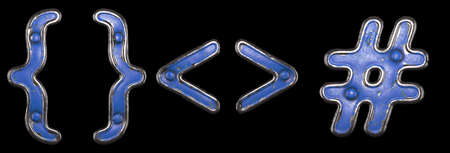 Set of symbols left and right brace, left and right angle bracket, hash made of painted metal with blue rivets on black background. 3d rendering