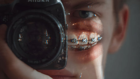 Close-up of a young man taking a selfie with a camera, revealing his braces in a unique perspective.