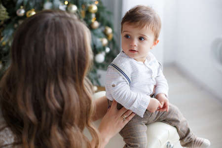 Happy family mother and little son near christmas tree on Christmas Eve. A woman playing with her son in anticipation of the New Year