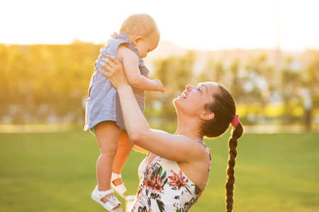 Loving mom holding her baby outdoors. Young mother hugging and kissing her little daughter