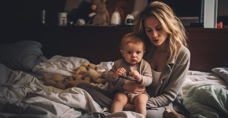 Stressed and tired mother suffering from headache while doing housework with her little baby in messy room. Mommy overwork with child. Depressed housewife in messy bedroom lying in bed