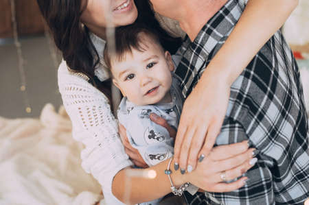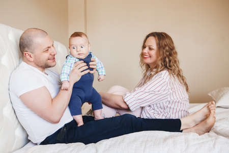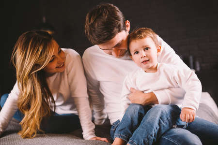young family mom dad and year-old son on the bed. having fun. love. tenderness