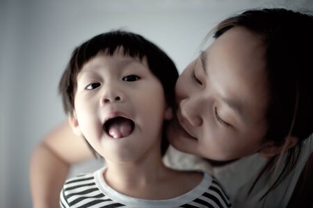 Asian boy crying in bad mood and behavior problem being persuade and encouraged by his mother