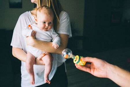 Portrait of a newborn baby. Mother holds a child in her arms. The first year of life. Care and health. ather gives a child a toy