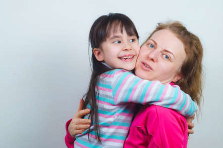 a mother with blond hair and her daughter are smiling and hugging. posing for the camera