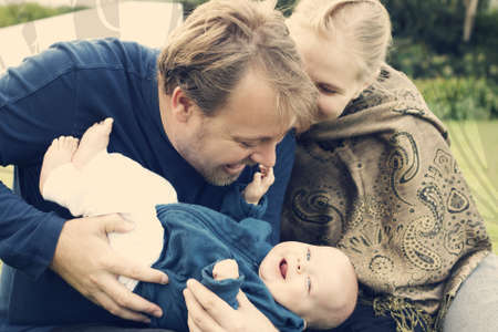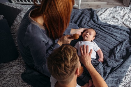 Young parents giving lots of attention to their baby. They are all sitting on a bed at home.