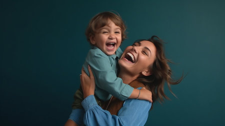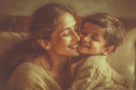 Mother and child are sharing a joyful moment, embracing each other with warm smiles, showing love and connection in a cozy environment.