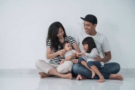 Happy family playing together in the living room at home. Father, mother and baby having fun together.
