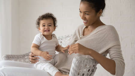 Portrait of young biracial mom hold cuddle cute smiling little newborn baby daughter play at home together. Happy African American mother embrace hug small ethnic toddler child. Motherhood concept.