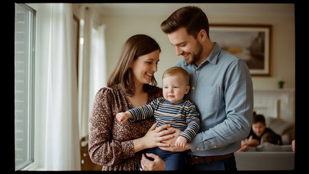 A smiling baby is held by parents in a cozy indoor setting, likely a home. Natural light illuminates the scene, highlighting the soft textures of clothing. A potted plant adds a touch of nature. This image is suitable for various commercial uses, including advertisements for family products and editorial content on parenthood.