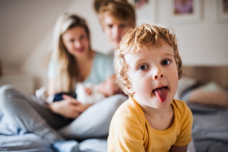 A small toddler boy with parents and newborn baby at home.