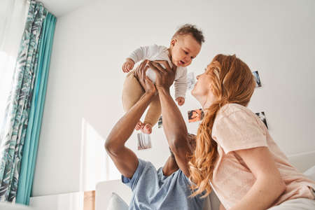 Young man lying on bed and raising his child up they playing in the bedroom