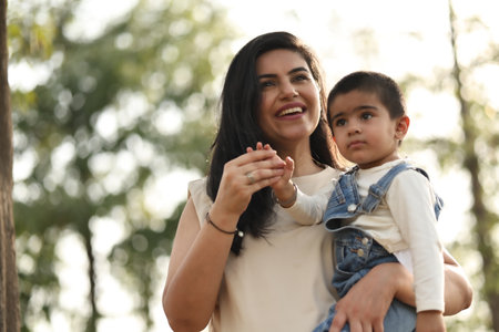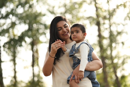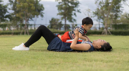 An Asian mother and toddler son (1-year-old) are playing, laugh, and relax together in the garden on a cloudy day. Full-length outdoor portrait happy and fun in public space ideas for family time.